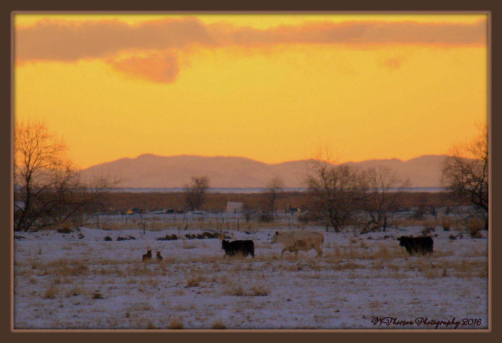 Two Coyote Tormenting Three Cows 2-1-2016.jpg