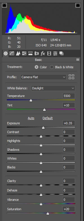 Please don't interpret anything I've done as trying to tell you how to process your shot, I'm just trying to show there's some room to play without blowing out the Shadows after using the Camera Flat and Daylight white-balance adjustments.