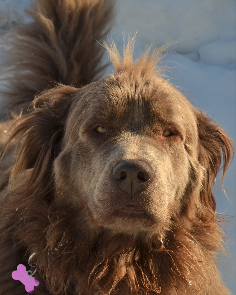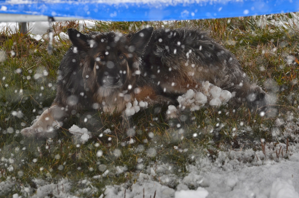 Poor Scouty- Long leg feathers and heavy snow makes for big snowballs dangling on his legs. Taking a break from playing to remove snowballs under the trampoline. I know he's not in focus in this shot but liked the effect