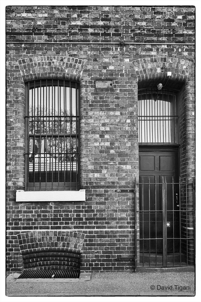 A nondescript brick wall, window and door. Can't add much more to that description.