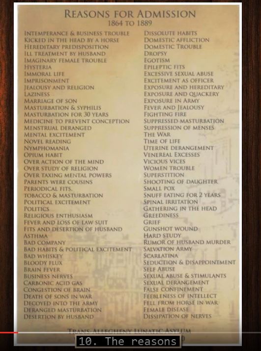 Wow! I was born and raised about 25 miles from the Trans-Allegheny Lunatic Asylum in Weston, West Virginia. Looking down the list, you could have (and probably still could if they were still open) found a dozen reasons to admit me. Let's see, Immoral Life (although I have tried hard to do otherwise), Jealousy, Laziness, Over action of the mind (???!!!), Over taxing of mental powers, periodical fits (is this from reading bad periodicals/magazines ???), Bad Habits, Asthma (?!?!?!?), Egotism, Grief, Hard Study (???), Salvation Army (I donate to them - does that make me crazy???), and probably a few more.