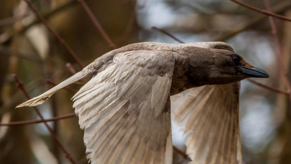 I've been seeing a white bird flying around with the murder of crows in my neighborhood lately and I finally got a shot of it. A white crow? It squawks and caws with the rest of them, its not a loner. Definitely not albino, but its tail feathers and wings are most certainly white, or at least not black as all other crows I've seen are.