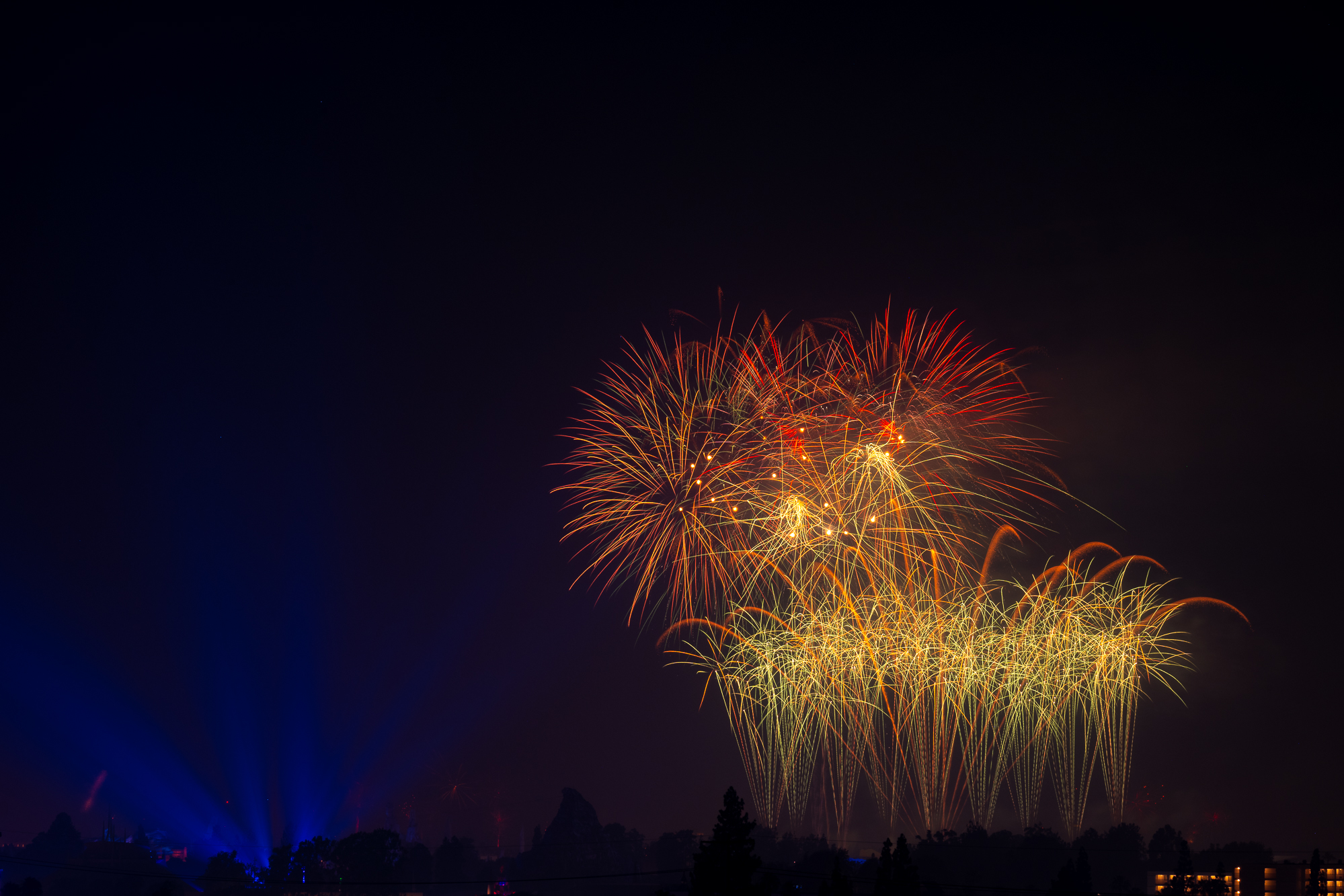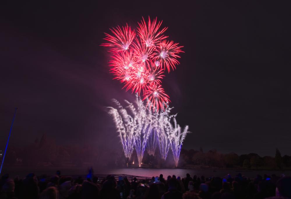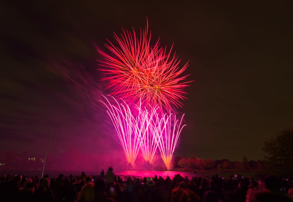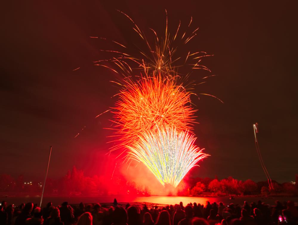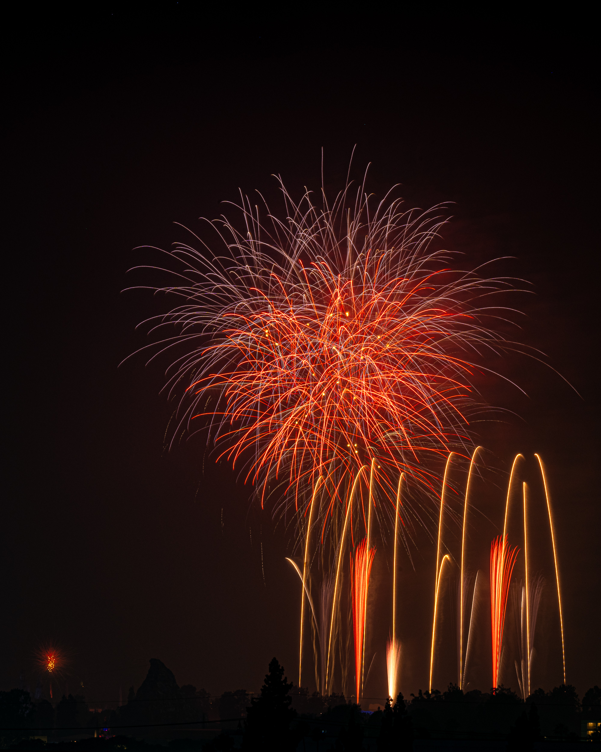 It's a guessing game. The idea is to set the base ISO, use a small aperture and then trigger bulb mode with a remote. The remote takes away the need to set a shutter speed time and you can just keep the exposure going until you want it to stop. The smaller the aperture, the longer the exposure has to be, OR, the brighter the fireworks have to be. I had to play around with it but it seems most of the shots I liked are f18-f22 and 20-45 seconds. To capture one firework, a good starting point might be f8, 5 seconds using the remote to start the exposure when the firework is launched and ending the exposure before the next one is launched. Getting multiple fireworks means increasing time which means you need to decrease light to the sensor by going with a smaller aperture. The finale is very bright and lasts a long time and needs the smallest aperture or maybe use a neutral density filter. Of course, each firework show is different so its hard to make a rule to follow but it was fun trying different things.
