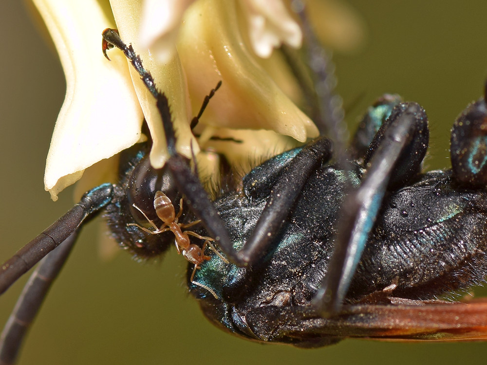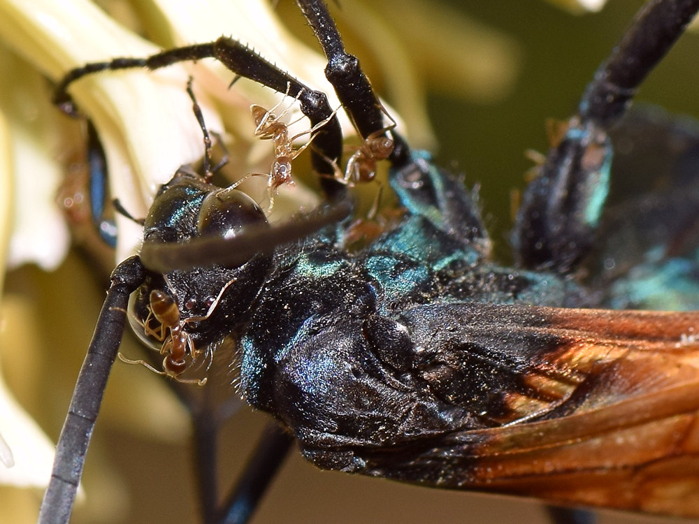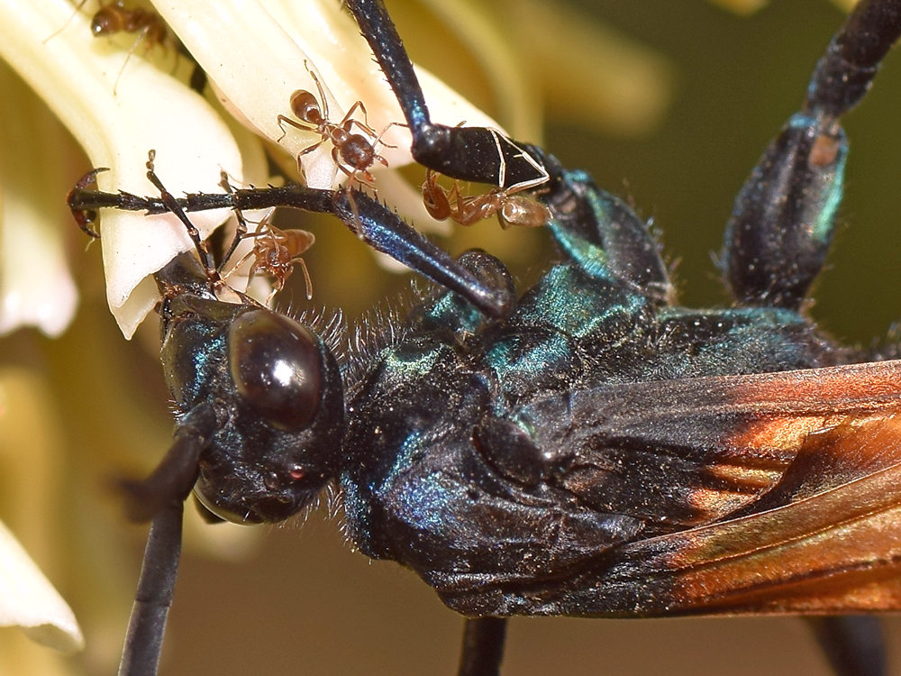 Thanks. It's a tarantula wasp, a favorite of mine. Mohave reed milkweed is one of its main food sources, which is also a favorite with aphids and so, ants. It did not seem bothered at all by the them crawling about and biting; it just kept feeding. Given the potency of its sting, I'm real glad it didn't mind me, either.