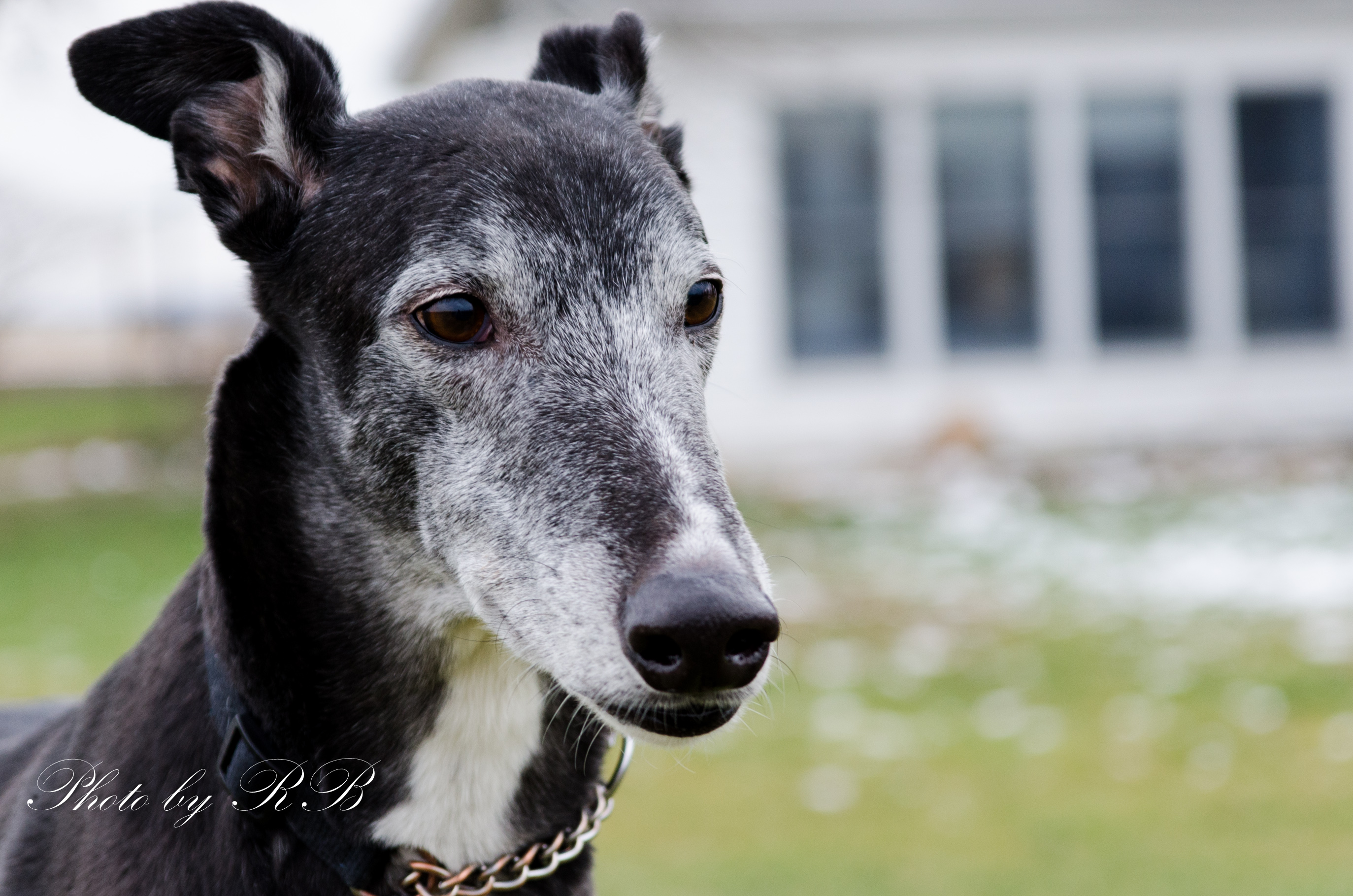 This is Jay, he's one of our Greyhounds. His racing name was Rapido Jay with an ear tattoo of 25E-30886. He has seven brothers and sisters. His Sire is Rapido Omar, and his Dam is Rapido Tamara, none of which I've seen. Out of 37 races, he won 6 and came in second 8 times. Then he broke his leg. This is when we appeared in his life and we rescued him, fixed him up, then we fostered him, then kept him. He's now taking his retirement very seriously where he gets three fenced acres to run around in outside, and a Coolaroo bed to sleep 20 hours a day inside.